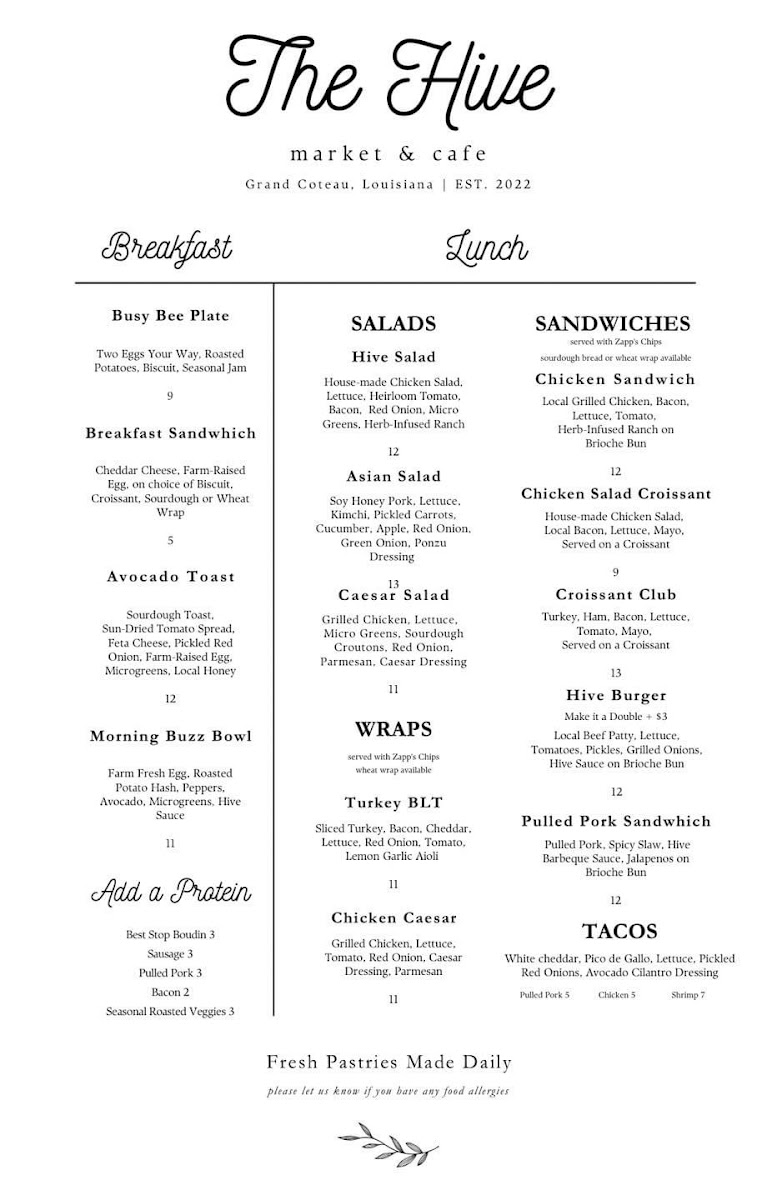 Welcome to THE HIVE MARKET, a charming cafe nestled in the heart of Grand Coteau, Louisiana. This delightful spot is more than just a coffee shop; it's a community hub that radiates warmth and creativity. The menu features a selection of hearty breakfasts, including the popular Hive Breakfast, perfect for starting your day right.